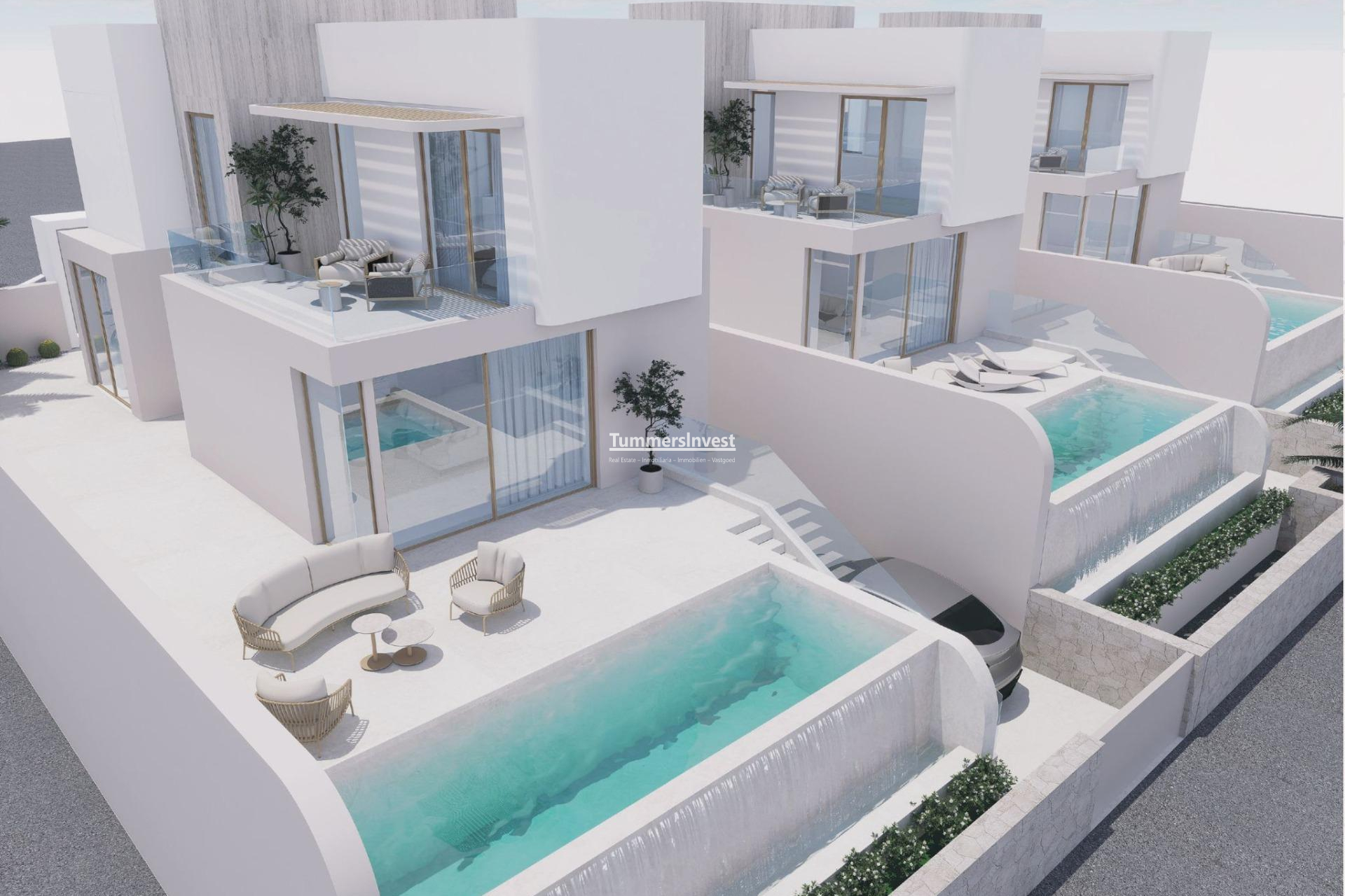 Exclusieve nieuwbouwwilla’s met infinity-zwembad nabij La Finca Golf-Algorfa Boutique-project naast La Finca Golf Resort-Costa Blanca Zuid Ontdek dit exclusieve nieuwbouwproject met slechts drie vrijstaande villa’s, gelegen naast La Finca Golf Resort in Algorfa, een van de meest prestigieuze golfbestemmingen aan de Costa Blanca Zuid. Omgeven door natuurlijke landschappen en met een weids uitzicht over het platteland van Vega Baja, bieden deze villa's privacy, ruimte en een hoogwaardige mediterrane levensstijl. La Finca Golf is een gerenommeerde 18-holes golfbaan die bekend staat om zijn uitstekende onderhoud en rustige ligging. Het resort beschikt ook over een hotel, spa, restaurants en sportfaciliteiten, waardoor het een ideale locatie is voor zowel permanente bewoning als vakantiehuizen. Ruime villa's met kelder en flexibele woonruimtes Elke villa beschikt over drie slaapkamers en vier badkamers, waarvan drie en suite, plus een extra gastentoilet. De woningen zijn verdeeld over drie verdiepingen en ontworpen om comfort en veelzijdigheid te maximaliseren. Het kelderniveau van ongeveer 68 m² is volledig afgewerkt, beschikt over een badkamer en heeft natuurlijk licht, waardoor het flexibel kan worden gebruikt als fitnessruimte, speelkamer, gastenverblijf of extra leefruimte. Buiten de woonruimte is er een groot terrein dat kan worden gebruikt voor het parkeren van meerdere voertuigen of als privéterras. De begane grond beschikt over een open woon- en eetkamer met een volledig uitgeruste moderne keuken, één slaapkamer met en-suite badkamer en een gastentoilet. Grote ramen bieden directe toegang tot het buitenterras en het indrukwekkende infinity-zwembad. De bovenverdieping omvat twee extra slaapkamers met en-suite badkamers en toegang tot privéterrassen met prachtig vrij uitzicht. Modern ontwerp en hoogwaardige voorzieningen Deze villa's zijn gebouwd met de nadruk op comfort en energie-efficiëntie. Tot de voorzieningen behoren volledig uitgeruste keukens met apparatuur, ingerichte badkamers met wastafels, spiegels en doucheschermen, en elektrische rolluiken in de slaapkamers. Bijkomende specificaties zijn onder meer volledig geïnstalleerde kanaalairconditioning en een aerothermisch systeem voor warm water, wat het hele jaar door efficiëntie en duurzaamheid garandeert. Toplocatie dicht bij golf, stranden en voorzieningen Het project ligt op een uitstekende locatie met gemakkelijke toegang tot nabijgelegen steden en voorzieningen. De stranden van Guardamar del Segura liggen op slechts 14 km afstand en bieden lange zandstranden. Belangrijke afstanden zijn onder meer de luchthaven van Alicante (35 km), Almoradi (5 km), Benijofar en Ciudad Quesada (10 km), Torrevieja en Orihuela Costa (15 km) en La Marquesa Golf (12 km). Het clubhuis van La Finca Golf ligt op loopafstand, wat bijdraagt aan het gemak van deze toplocatie. Ideale levensstijl en investeringskans Deze villa's zijn perfect voor golfliefhebbers, natuurliefhebbers en kopers die op zoek zijn naar een moderne woning in een rustige maar goed bereikbare omgeving aan de Costa Blanca. Neem vandaag nog contact met ons op voor meer informatie of om een privébezichtiging te regelen en uw nieuwe villa in de buurt van La Finca Golf te bemachtigen.